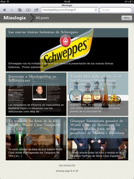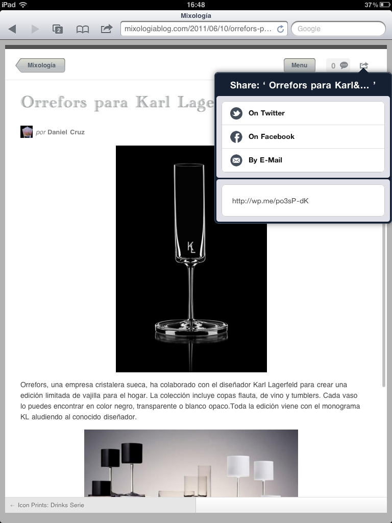 MixologiaBlog en tu iPad 10 junio 2011 / Daniel Cruz Si tienes un iPad, ya puedes disfrutar del nuevo diseño de MixologiaBlog exclusivo para el gadget de Apple. También tienes más posibilidades para compartir los contenidos con tus contactos vía Facebook, Twitter o Email. Comparte esto: Comparte en Facebook (Se abre en una ventana nueva) Facebook Compartir en X (Se abre en una ventana nueva) X Enviar un enlace a un amigo por correo electrónico (Se abre en una ventana nueva) Correo electrónico Compartir en LinkedIn (Se abre en una ventana nueva) LinkedIn Compartir en Reddit (Se abre en una ventana nueva) Reddit Imprimir (Se abre en una ventana nueva) Imprimir Me gusta Cargando... Relacionado