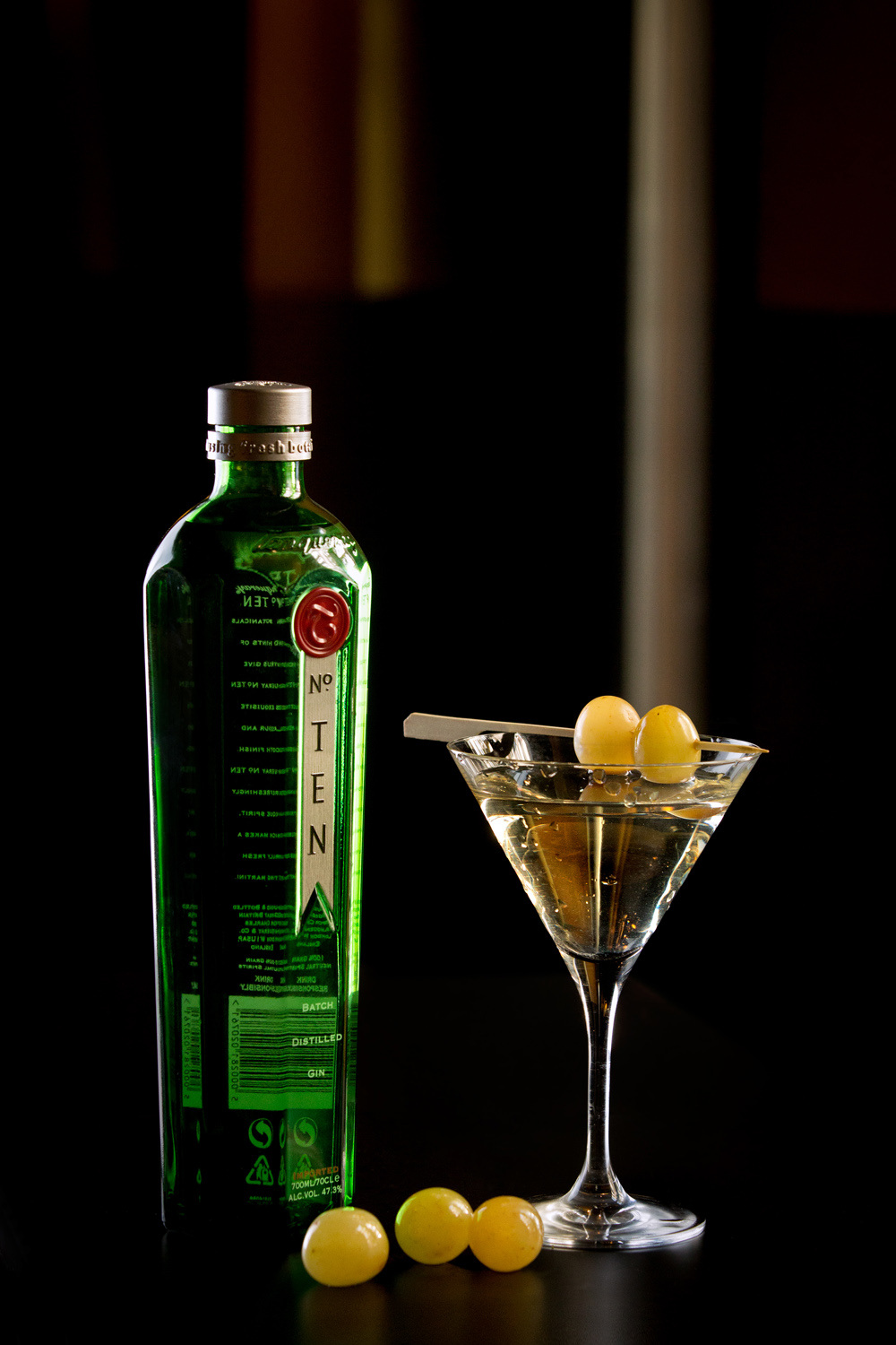 Agitamos los ingredientes en coctelera, lo servimos en copa de cocktail y lo decoramos con brocheta de uvas blancas y twist de limón.