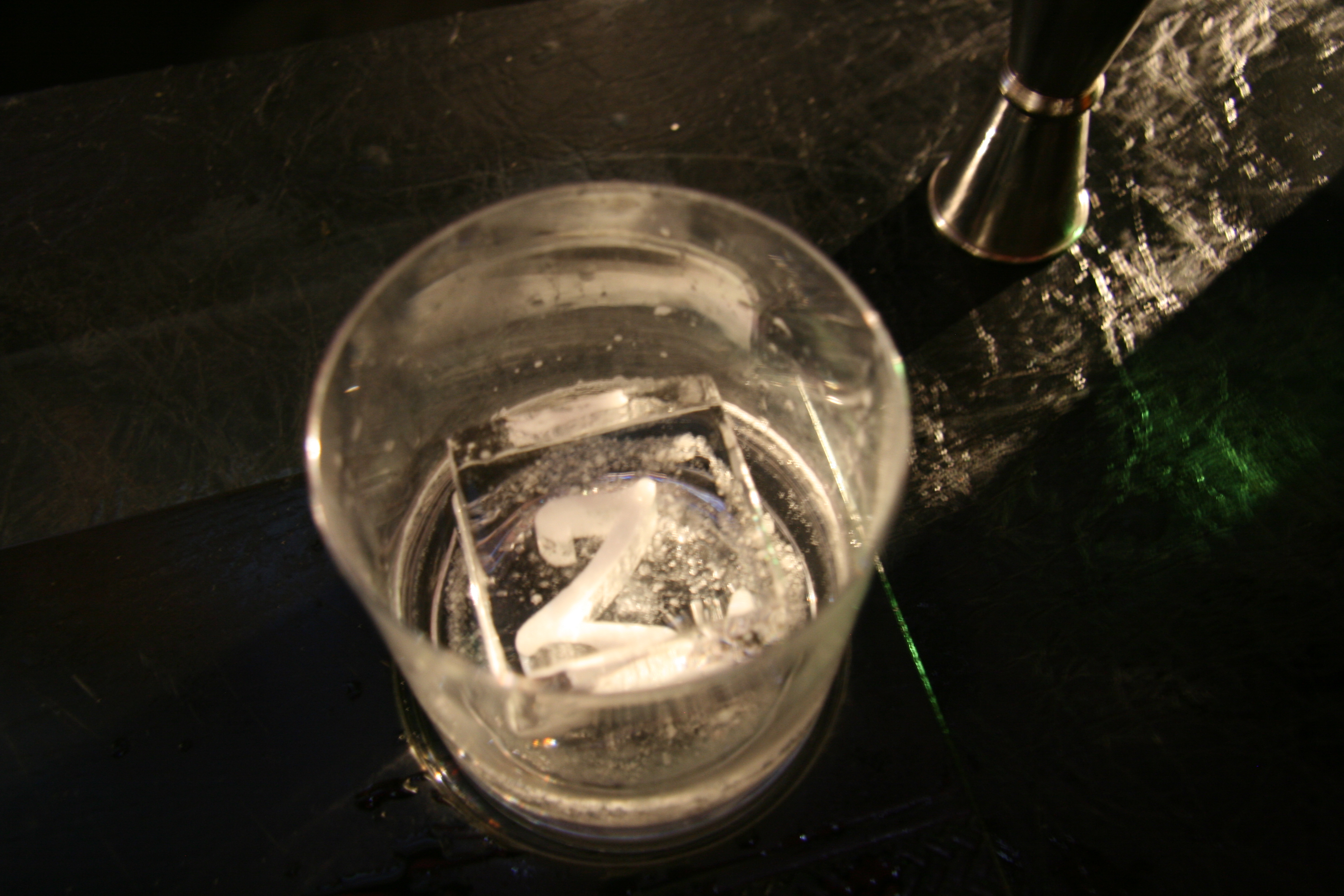 Empezó a girar la cuchara coctelera en dirección de las agujas del reloj en búsqueda de la perfecta dilución y temperatura. Unos segundos más tarde, un poco más de ron, y volvemos a hacer girar el compacto hielo con una «Z» realizada en laser en el interior.