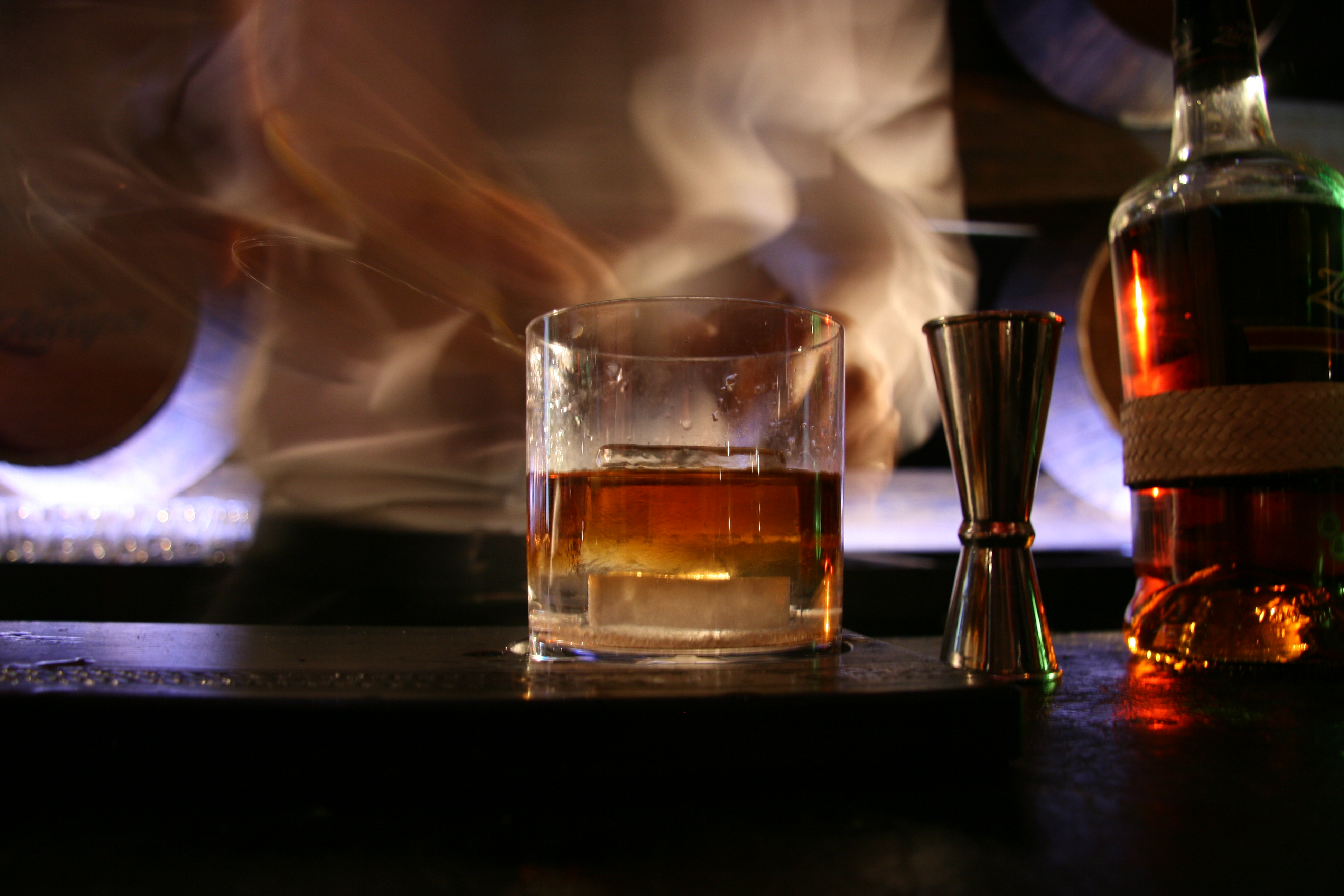En un tumbler, colocó un terrón de azúcar humedecido posteriormente con Angostura, una vez disuelto el terrón…empieza el espectáculo…
