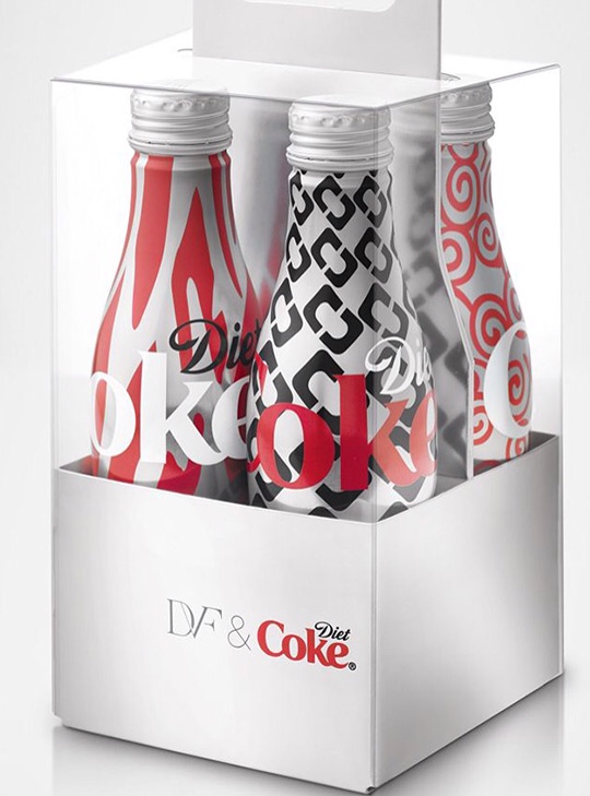 Siguiendo los pasos de Karl Lagerfeld el año pasado, Coca-Cola ha realizado una colaboracion con Diane von Fürstenberg. La edición limitada de coleccionista tendrá un precio de $30 y la totalidad de la facturación de este Packaging irá a la fundación The Heart Truth para apoyar el estudio y la prevención en problemas del corazón en la mujer.
