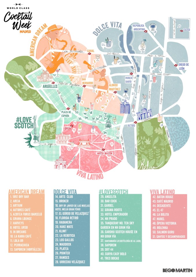 Para esta gran fiesta, Madrid se transformará en cuatro famosos distritos, escenarios de la mixología mundial. La zona centro y Gran Vía se transformará en #LoveScotch, una zona imprescindible para los amantes del buen whisky escocés; Fuencarral, Chamberí y Malasaña en American Dream, en la cual los visitantes podrán sentir el espíritu de Nueva Orleans y el Mardi Grass; La Latina en Viva Latino, donde reinarán el sabor y la alegría; y por último, el barrio de Salamanca se convertirá en Dolce Vita. un distrito sofisticado dedicado a quienes disfrutan del glamour de antaño.